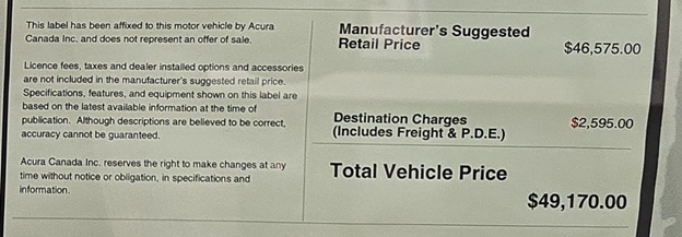 On the sticker, these are combined into one destination charge. They are not a surprise add on. They are part of the official manufacturer pricing for every new Acura sold in Canada.